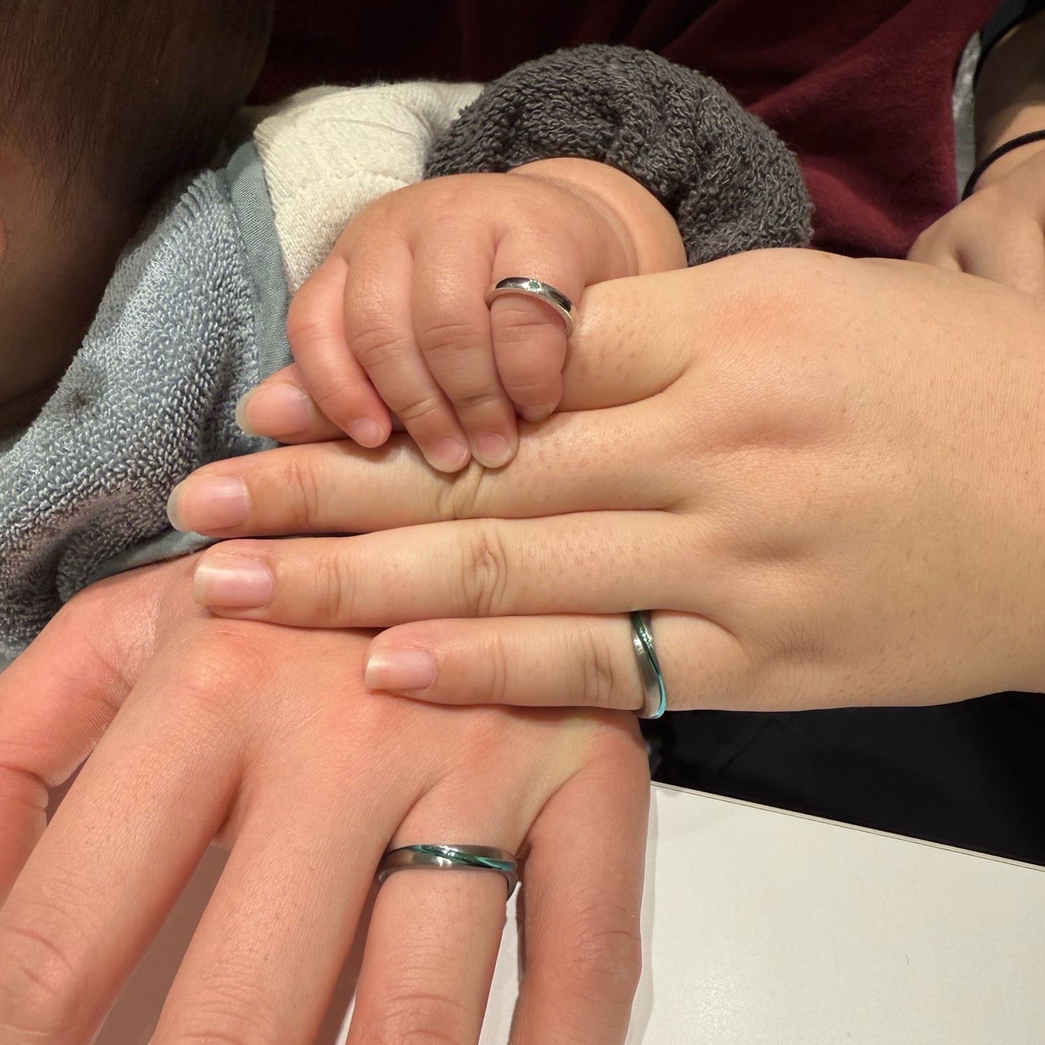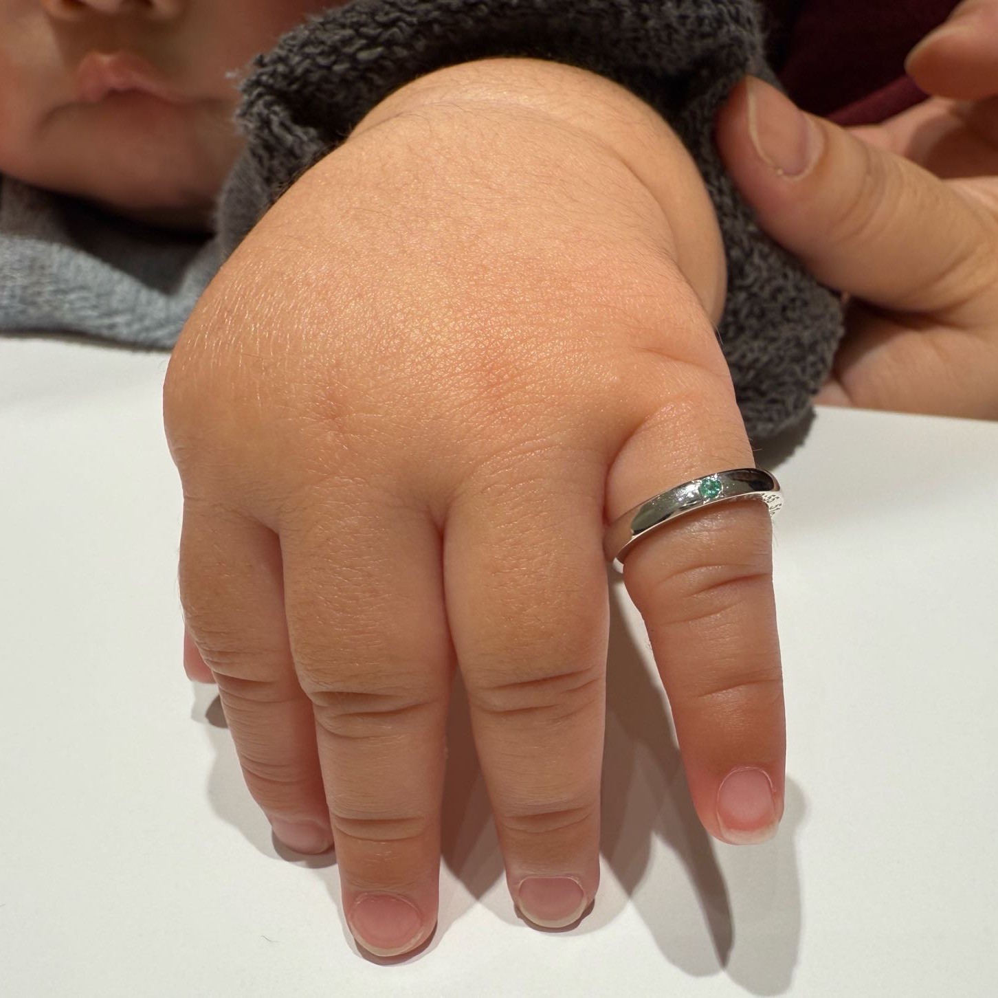 誕生石のカラーがパパとママの結婚指輪のカラーとお揃いになりました✌️